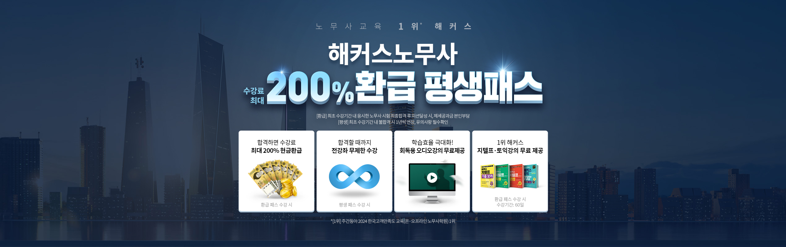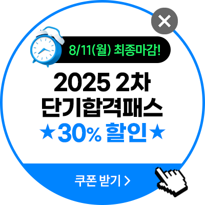 -  200% 환급 평생 무제한 패스: 26년 2차 시험일까지 무제한 수강 / 불합격 인증 시마다 수강기간 1년 연장(단, 1차 시험 과락 시 연장 불가)